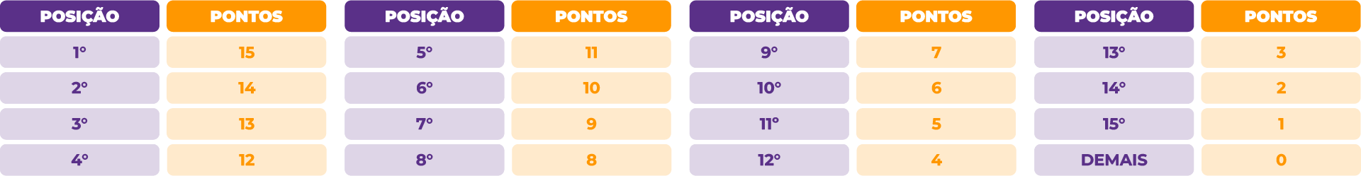 6.2.1. Receberão pontos as 15 primeiras colocadas de cada um dos grupos. A pontuação será concedida seguindo a ordem decrescente de colocação conforme o quadro abaixo: