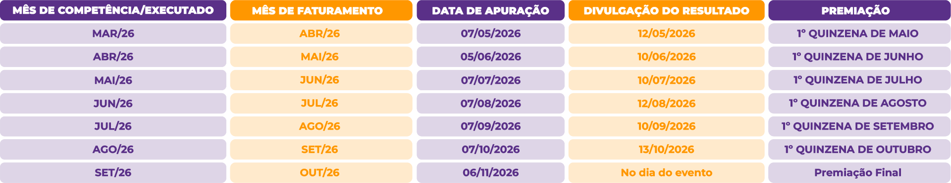 7.3. Segue o calendário de apuração e divulgação dos pontos bem como do repasse das premiações: