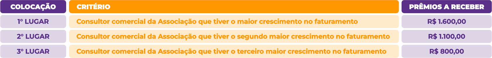 1.2. Reconhecer e premiar os Consultores Comerciais das Associações que se destacarem a cada mês, com base em critérios de classificação previamente definidos.